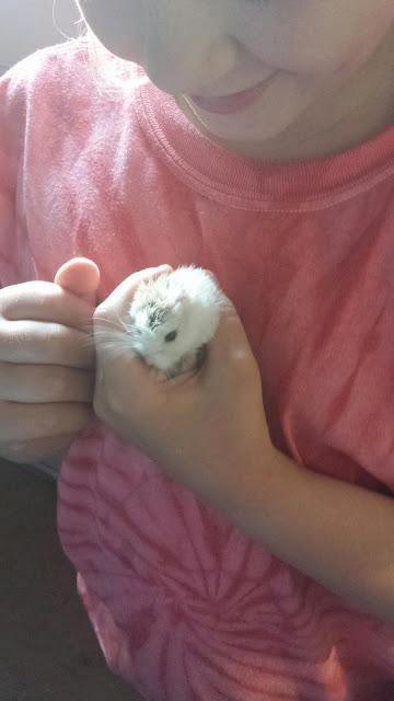 He's very tame and very sweet. We'll be researching more about roborovski dwarf hamsters this summer. Maybe I'll have my youngest write a report! (insert teacher mom evil laughter)